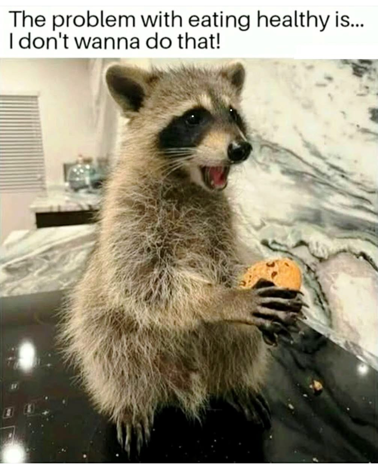 I don’t know where you find your jokes, but they ALWAYS make me laugh. The raccoon saying it doesn’t WANT to eat healthy is so true. Sometimes after hubby and I have been eating salads for dinner for days just the thought of lettuce makes us gag. Why CAN’T healthy food be made of chocolate?! lol