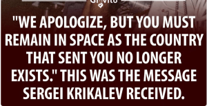 Krikalev is sometimes referred to as the “last Soviet citizen,” having been aboard Mir during the dissolution of the Soviet Union. With the country that launched him no longer existing, his return was delayed, and he remained in space for 311 days—twice as long as planned. (Source: Wikipedia)