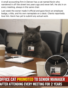 Yes, Kevin the office cat is a true story about a stray cat who wandered into a Denver accounting firm, was adopted, and later given an official employee badge and nameplate.